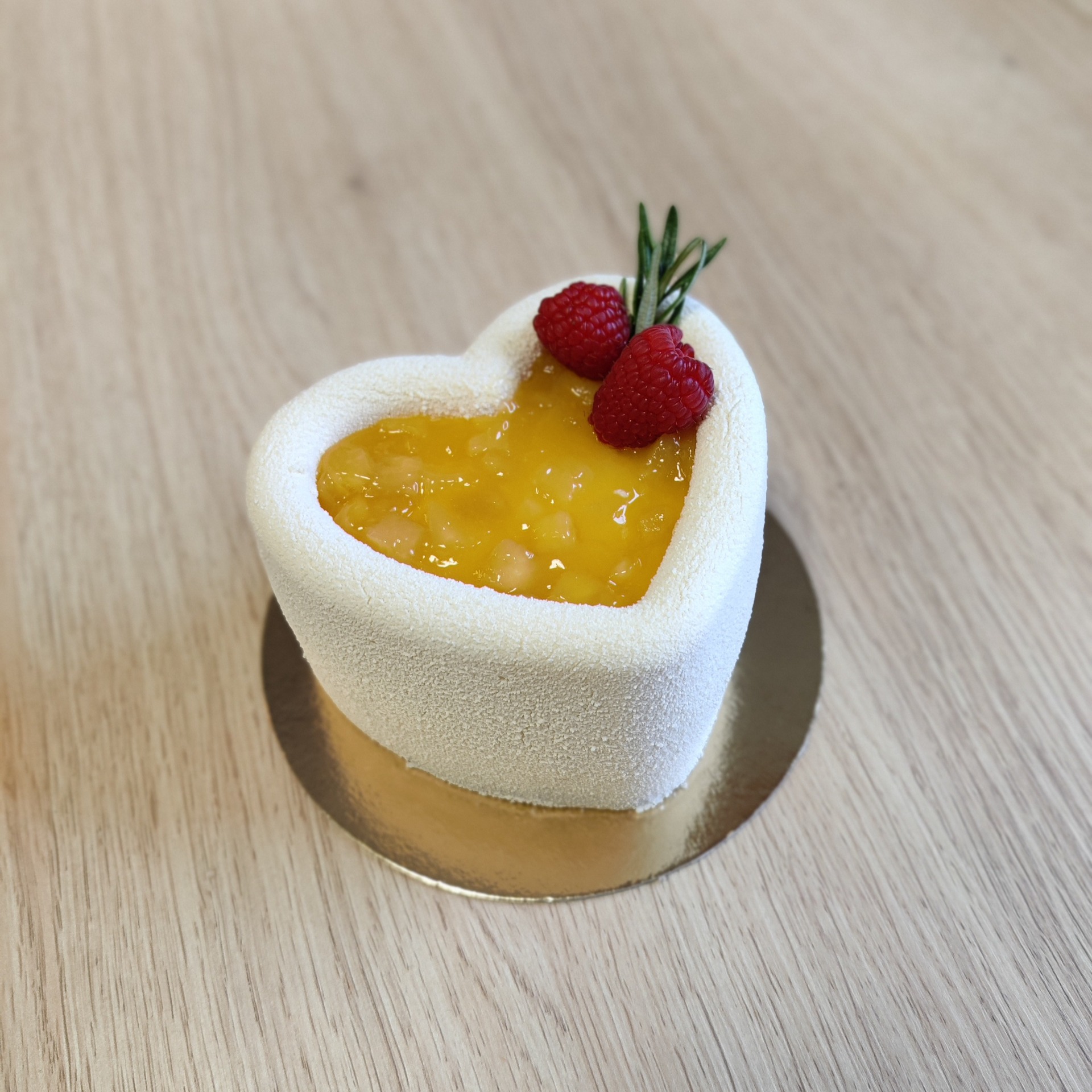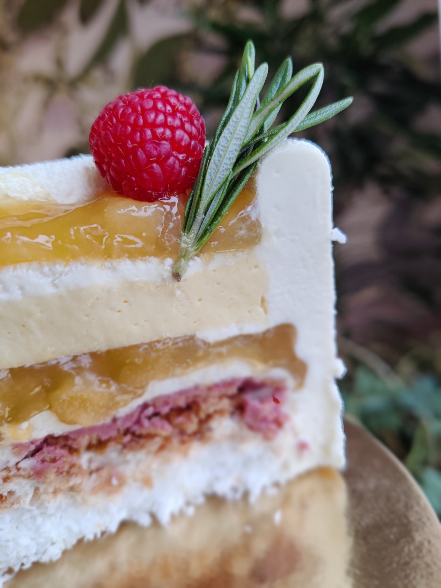Kokosový korpus, ruby čokoládová křupinka, mango kostky, marakujová pěna a celé je to v bílo-čokoládové pěně. Ozdobené mango polevou, malinami a rozmarýnem