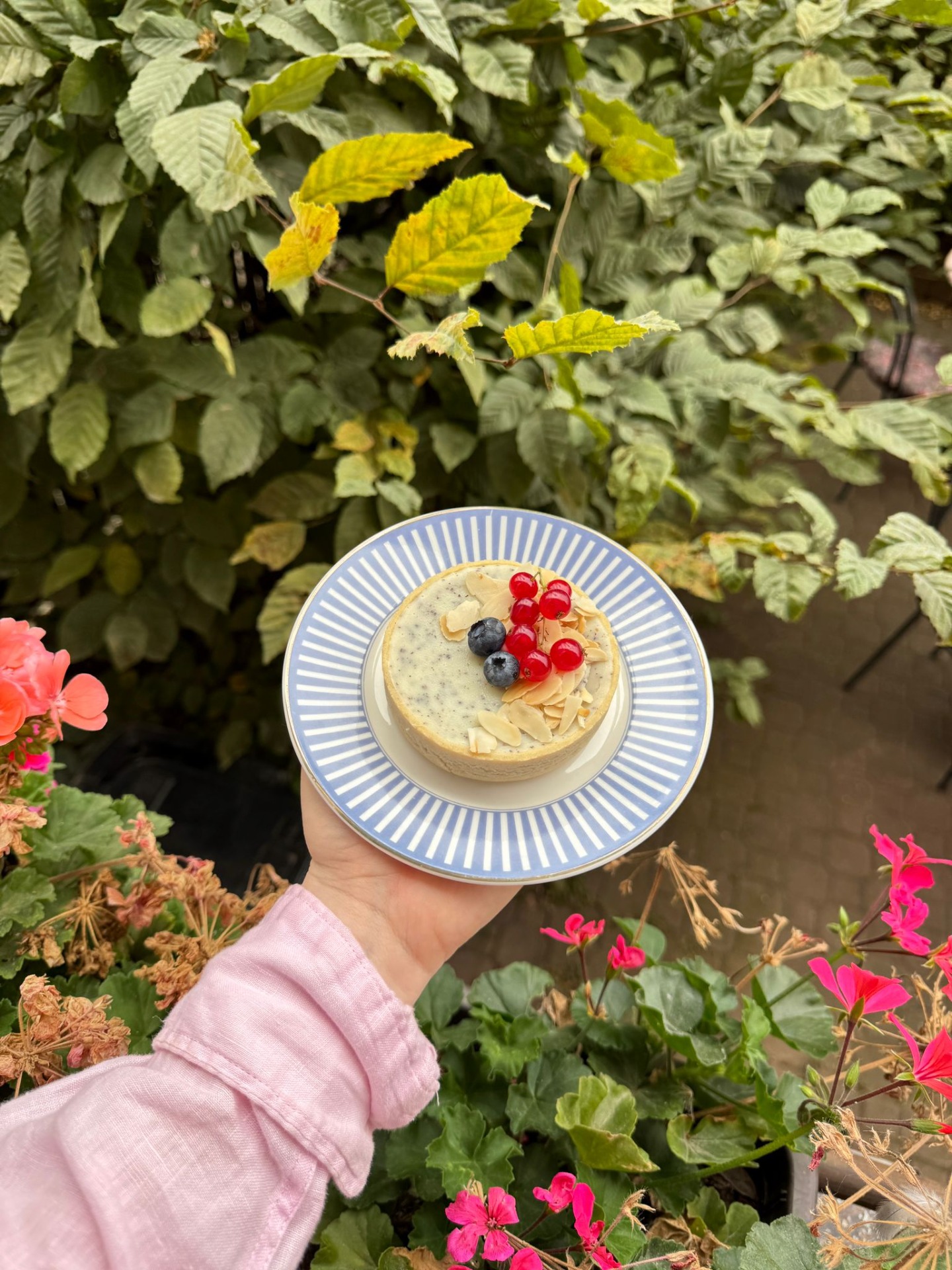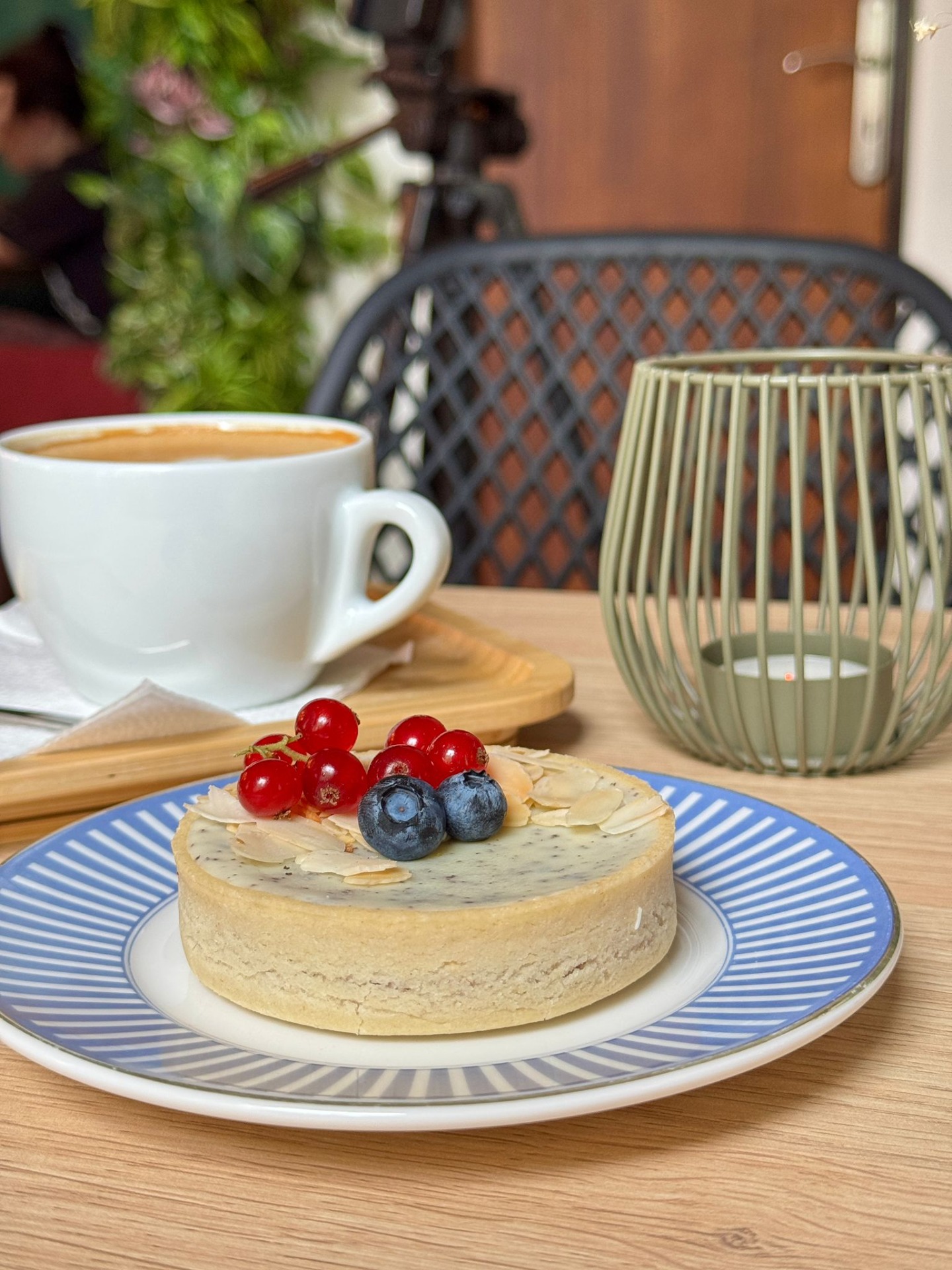 Tartaletka s švestkovou náplní, makovou ganache a vkladem z mandlí a bílé čokolády se skořicí. Zdobení mandlemi, borůvkou a podle dostupnosti rybízem/námi sušeným fíkem a nebo více borůvkami.