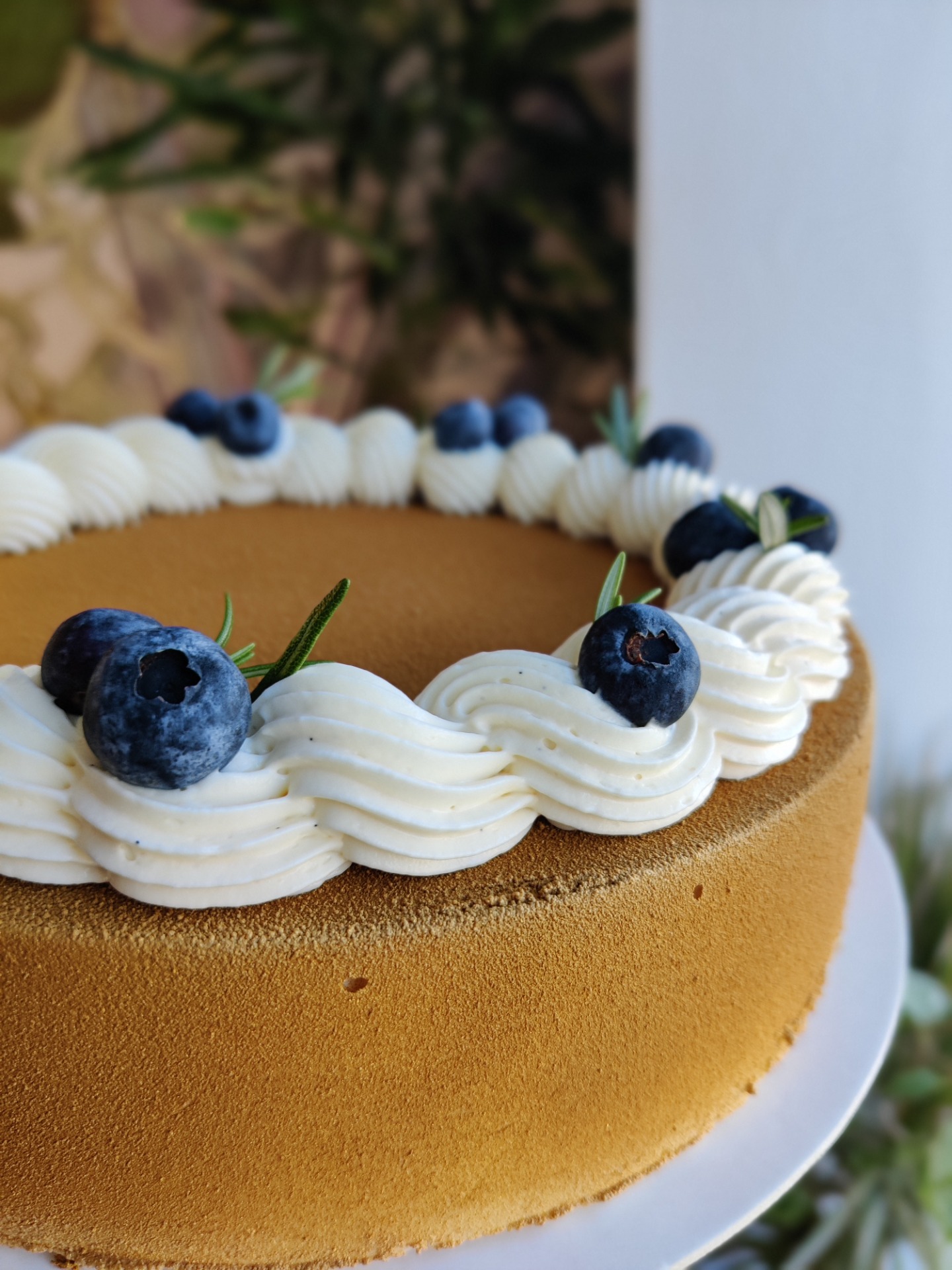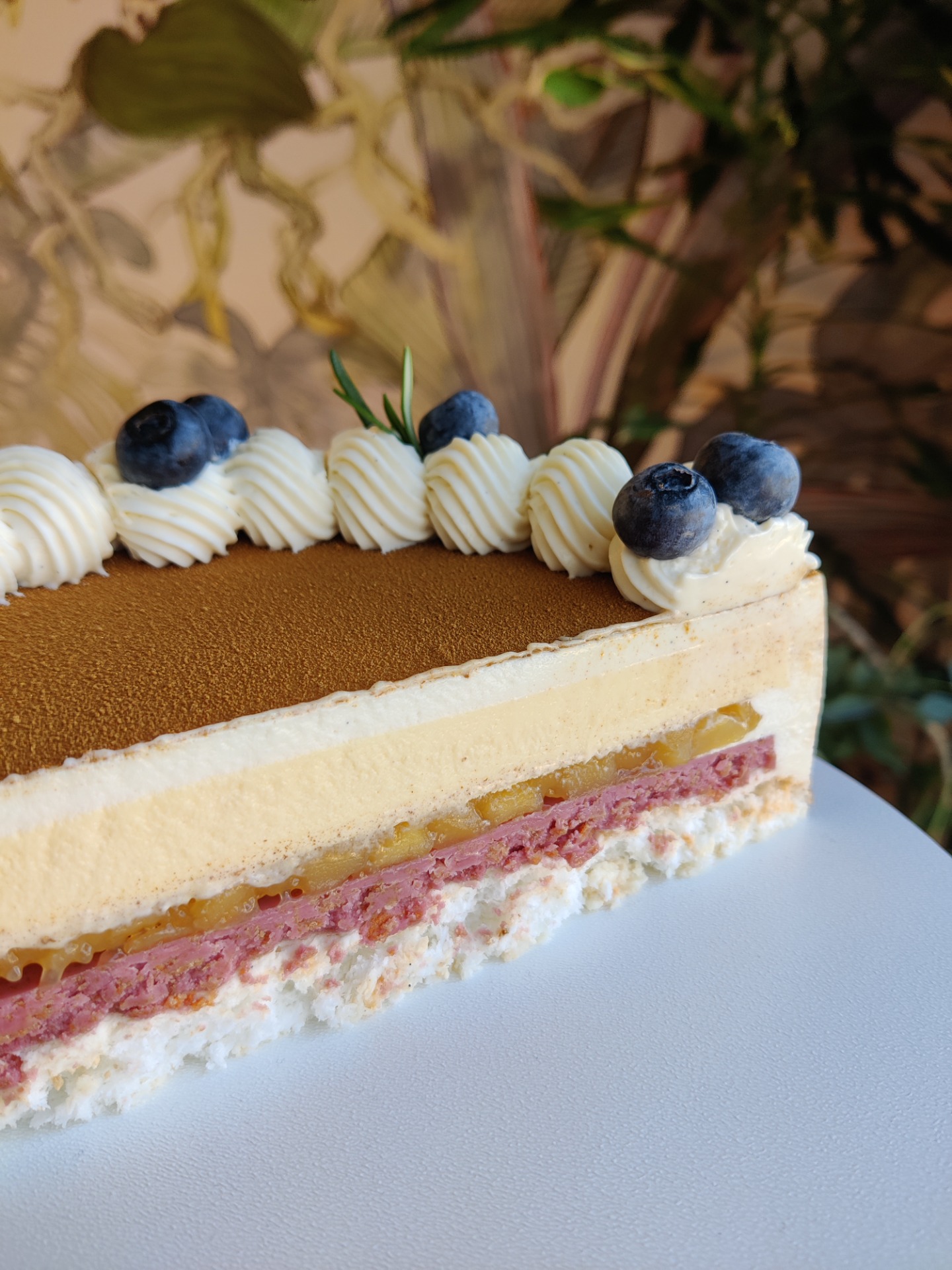 Kokosový korpus, ruby čokoládová křupinka, mango kostky, marakujová pěna a celé je to v bílo-čokoládové pěně. Ozdobené jemným vanilkovým krémem, borůvkami a rozmarýnem.