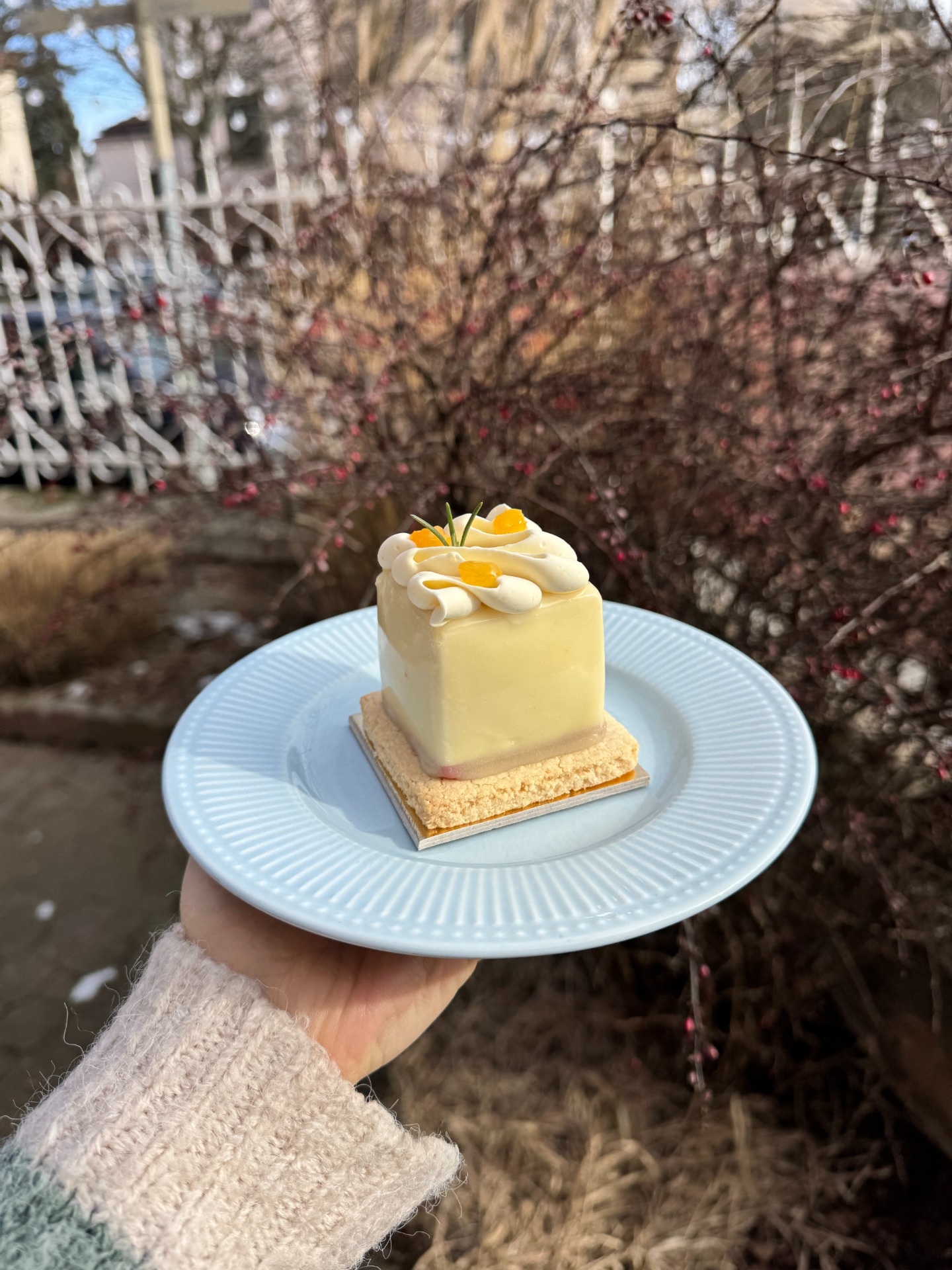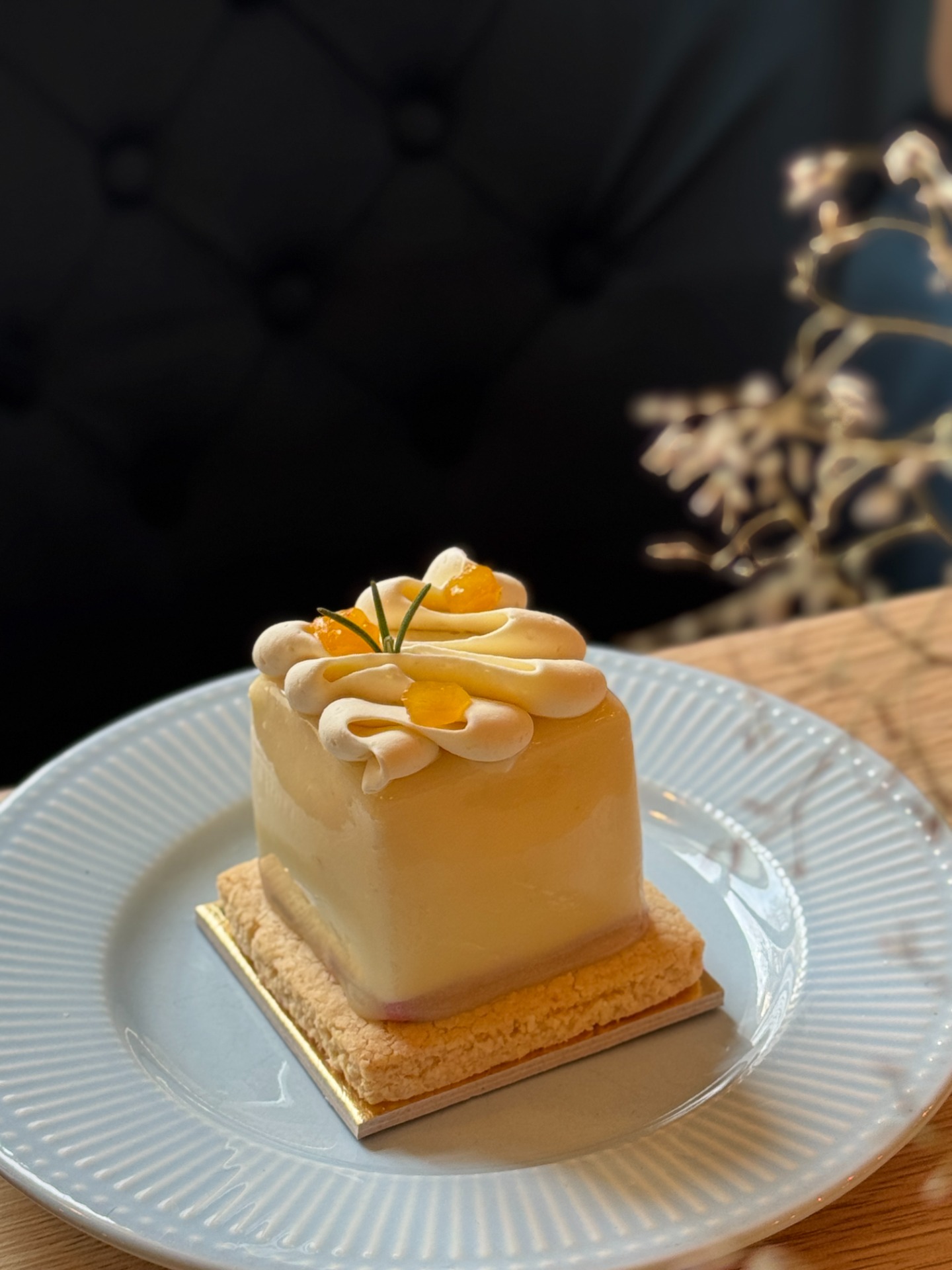 Kokosová sušenka, ruby čokoládová křupinka, mango kostky, marakujová pěna a celé je to v bílo-čokoládové pěně. Ozdobené zrcadlovou polevou, šlehanou vanilkovou ganache a mangem s rozmarýnem