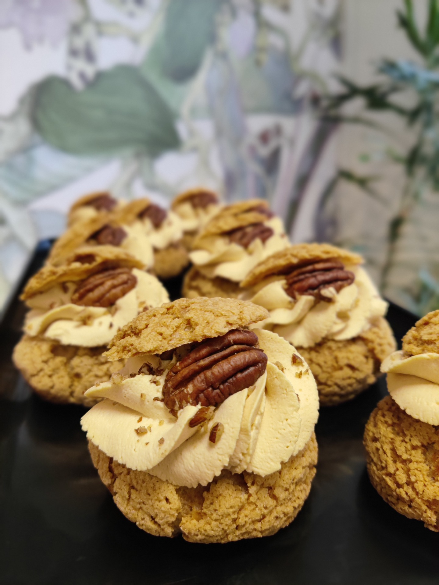 Choux s pekanovým krémem, doplněné nutelou a ozdobené karamelovou šlehačkou a pekanem.