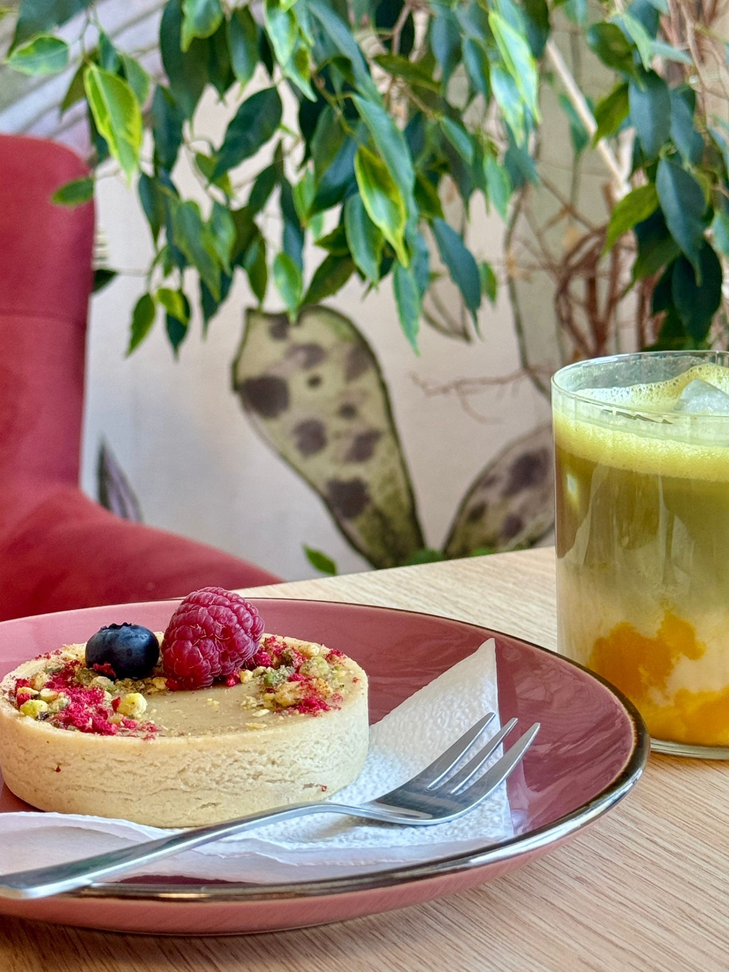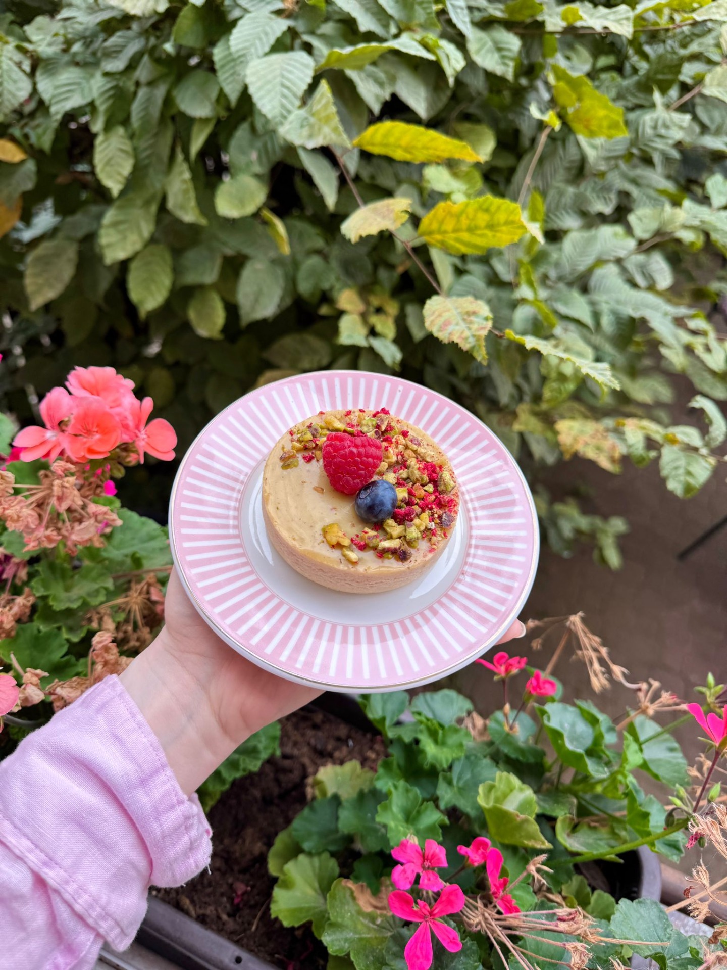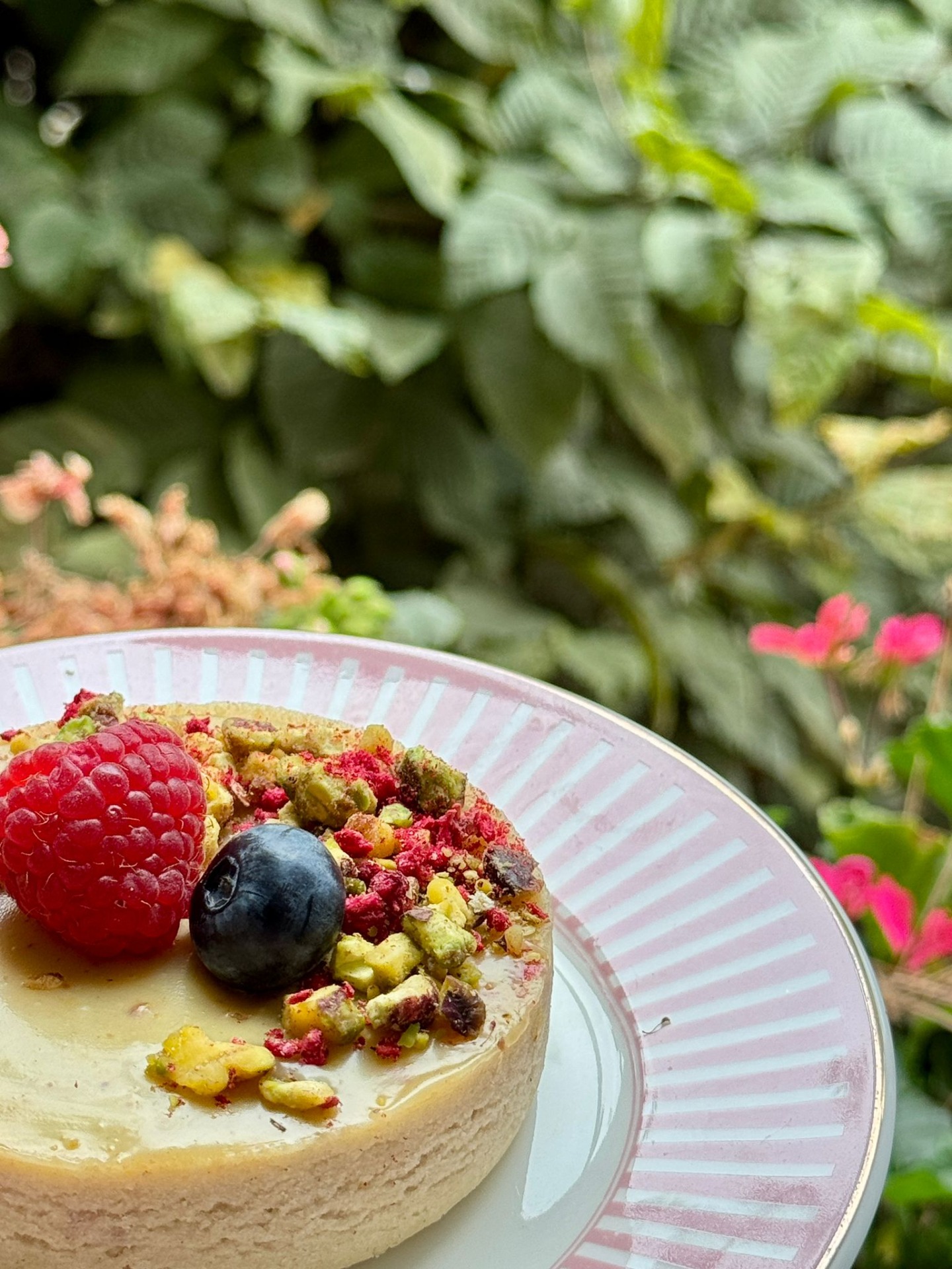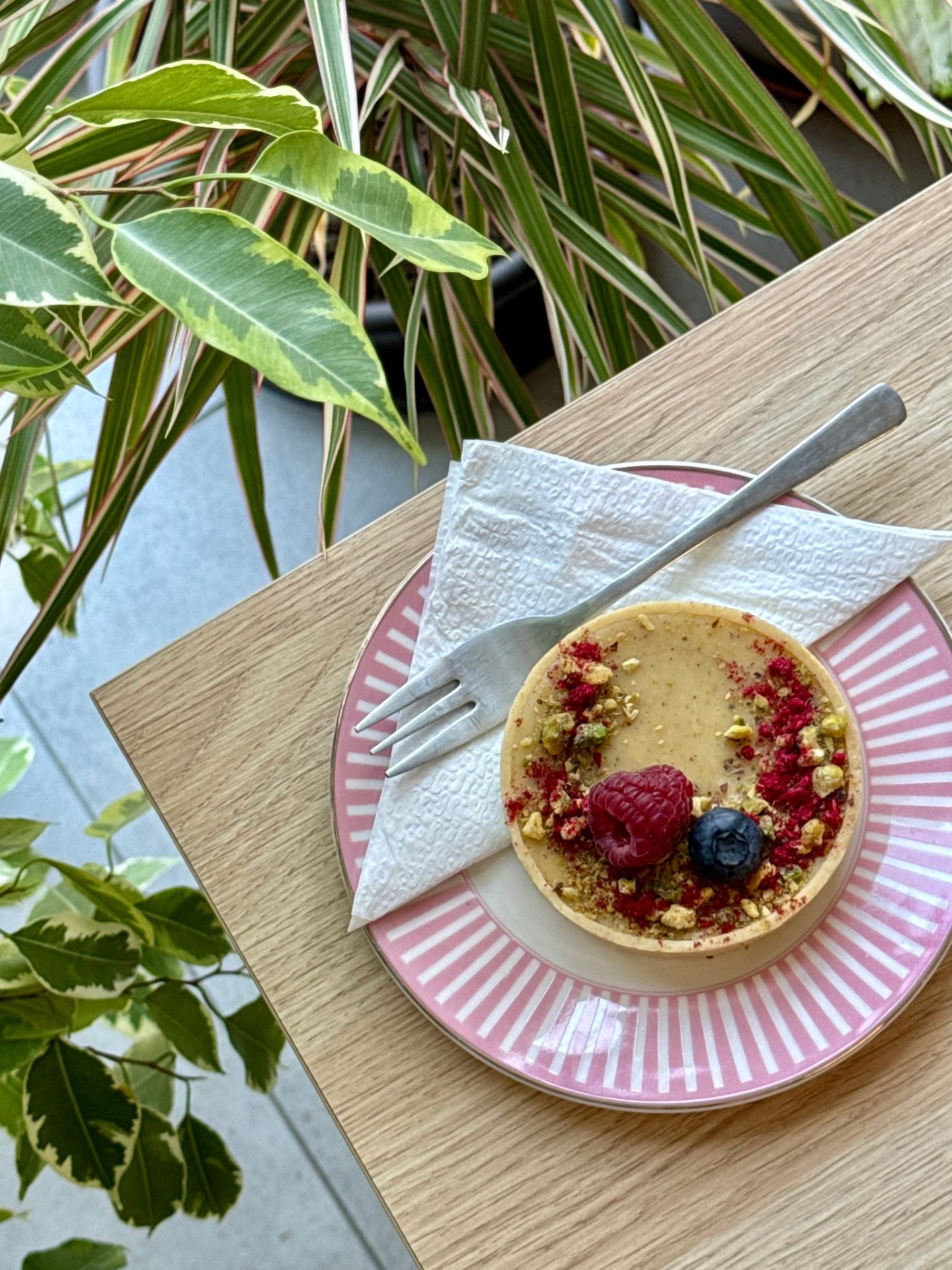 Pistáciovo-malinová tartaletka s křupinkovým vkladem.